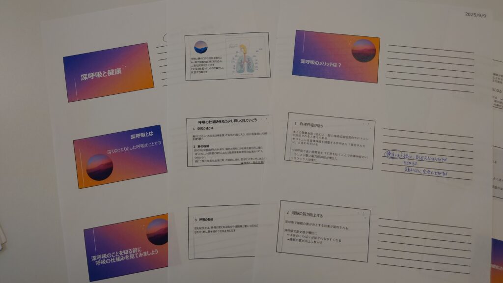 無意識で繰り返される呼吸について知識を共有し、その後深呼吸とは…の講義に。皆さん日頃深呼吸してますか?息を深く吸い吐き出すことで、身体や自律神経に効果があります。リラックスしたいときにはぜひ深呼吸を