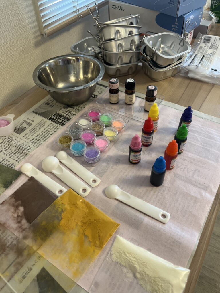 今日の午前中は、アロマオイルを使ったせっけんづくり。
