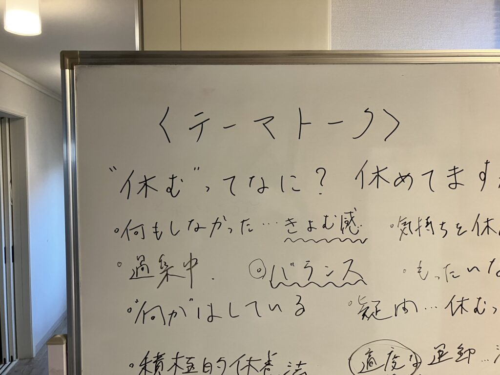 午後は心理プログラム「休むってなに?休めてる?」。プログラムの中で答えは出なくとも、メンバーさんの体験や意見考えを共有するのも有意義だったし多くのヒントを得られた時間だな感じました