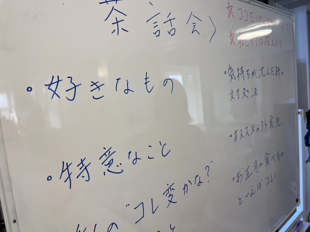 今回も沢山の方が参加されました。 今回は、自分のこれ変かな?とおもうこと、お正月の食べ物といえばこれ!気持ちが沈んだ時の対処法などなどをテーマに自由に話をしていただきました。それぞれに思っていること沢山聞くことが出来て、ためにもなり、自分だったら?と考える機会でした。 最後にお勧めの外食は?が一番盛り上がったのは自分だけでしょうか(*^-^*) プログラム終了後は談笑したり、将棋をしたりと気ままに過ごしていただき終了しました。 次回は2月末です。またお茶を飲みながらリラックスしてお話しましょう。