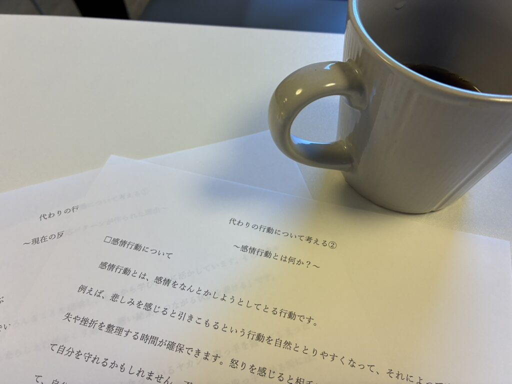 午後は新プログラムである『マインドフルネス&代わりの行動』を行いました。感情やそれに伴う行動について考えつつ、適時マインドフルネスを挟んでの実施となりました。落ち着いて自身についての理解を深める時間になっていれば幸いです。