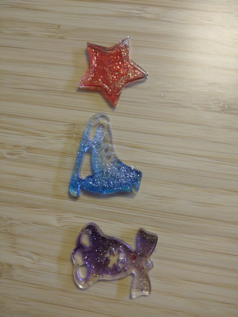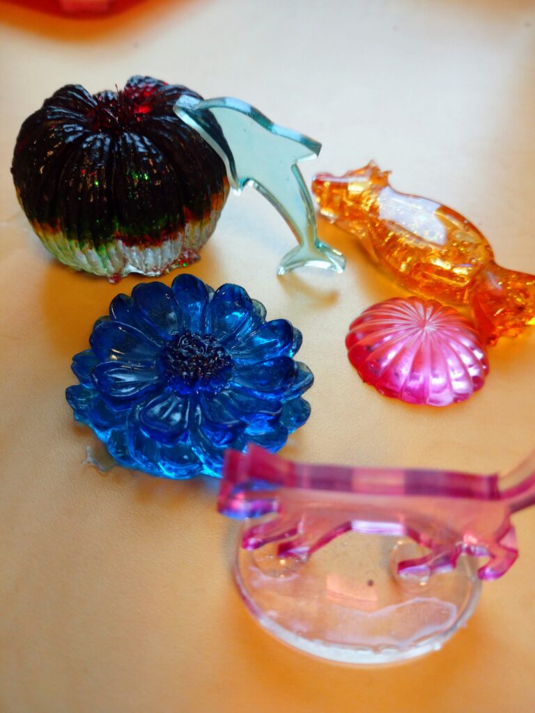 午前中は選択式で、創作かボードゲームを選んでいただきました。創作はレジンでした。レジンとは、透明な液状の樹脂で、紫外線に当てることで固くなるという性質を持った素材です。しかし……「固まらない」、やはりそんな声も聞こえてきました。今回、初心に帰りレジン液の説明書などから、いろいろと技を学んでいたのですが……。レジン、奥深いです。